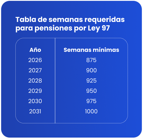 - Ley 97 IMSS → mínimo 875 semanas en 2026, aumentan hasta 1,000 semanas en 2031.
